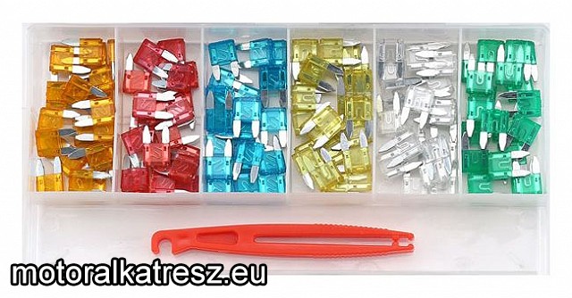 Autós mini méretű (kicsi) késes biztosíték 5A-30A (szélesség 11mm). | Tartalom: Mindegyikből 20db: 5A, 10A, 15A, 20A, 25A, 30A. További tartozék: biztosíték kiszedő szerszám. Az egész szett zárható műanyag dobozban. Megvásárolom: | | |